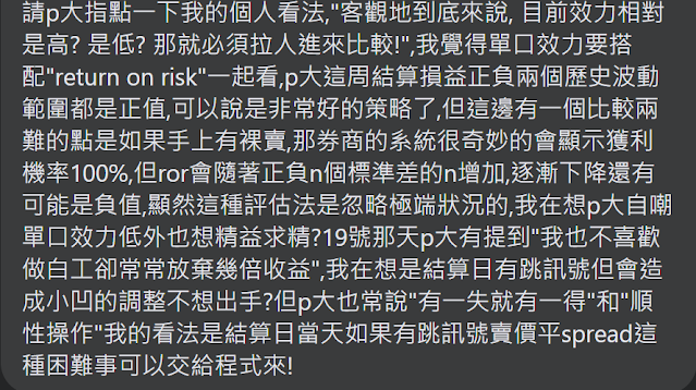 曾經在期交所夜盤正式開始前幾日, 寫過 5/15之後延長交易的應對之策, 經過數不清多少次夜盤錯誤動作的驗證之下, 完全符合記得有份報告說的: 單位時間下, 重評價次數愈多的商品, 愈難獲利! 現在我更覺得 --- 除了盡量不參與夜盤外, 在VIX變大的時候, 也要同時拉大訊號的觸發區間, 以免市場的改變, 讓原有的條件生出過多的誤動作, 徒增無意義的調整!!!